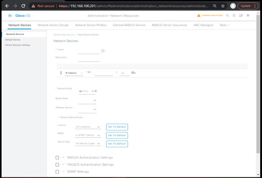 — add switch IP + RADIUS shared secret + SNMP credentials (v2c or v3) so ISE can poll.- On the Network Device add SNMP settings (community string or v3 user).